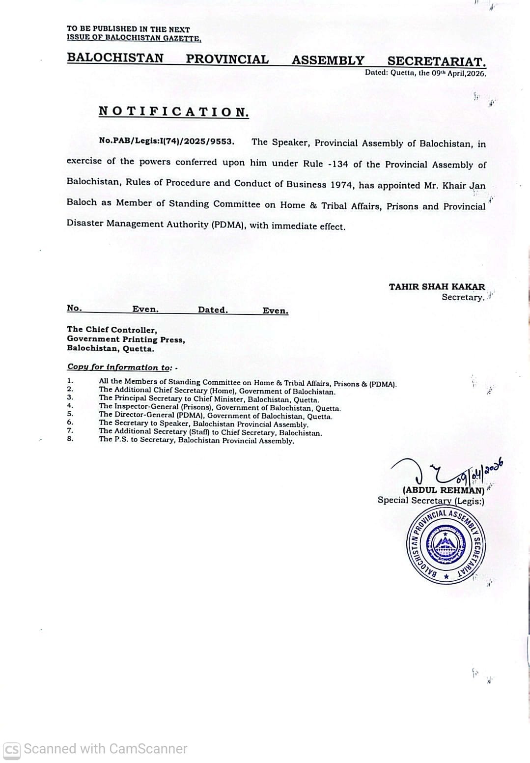 Khair Jan Baloch appointed as member of standing committee on Home and Tribal Affairs, Prisons & Provincial Disaster Management Authority (PDMA).