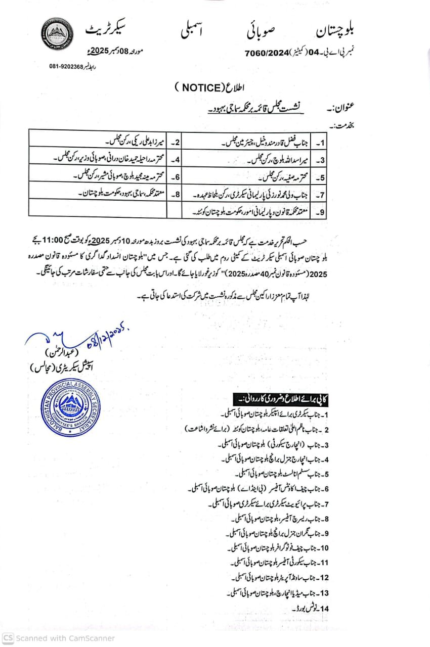 Prince Ahmed Omer Ahmedzai (MPA) cease to act as Chairman of Standing Committee on Irrigation, Energy, Environment, and Forest & Wildfire on 9th of December, 2025.