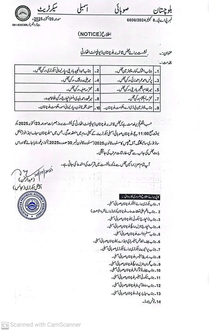 Balochistan Assembly Agenda for 20 oct 2025 sitting