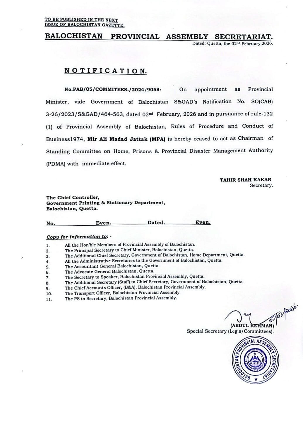 Ali Madad Jattak (MPA) ceased to act chairman of standing committee on Home, Prisons PDMA with immediate effect.